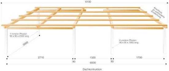- Для несущих столбов под навес используют деревянные брусья сечением 90 на 90 мм (для нашего примера –5), высотой 196 см для передних и 230 см для задней.