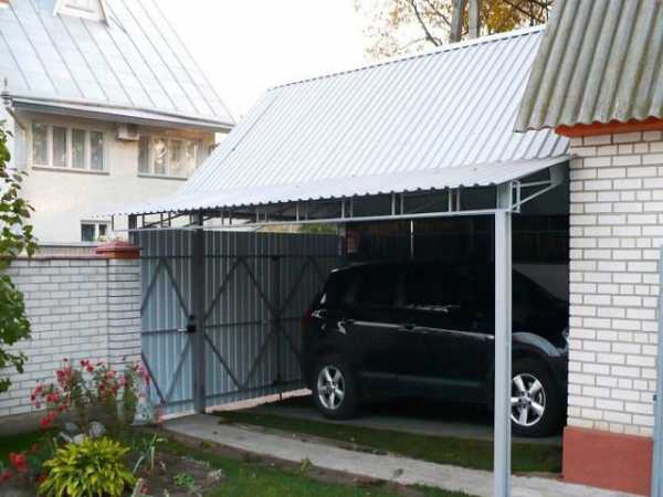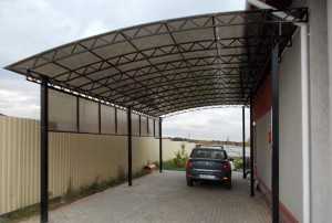 Часто навес под машину выполняется из металлопрофиля. Кровельное покрытие выбирается с учетом остальных дворовых построек. Навес для машины кроется листами профнастила, металлочерепецей и поликарбонатом.