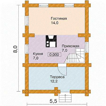 Вход в этот дом начинается с террасы, площадь которой составляет 12,2 кв. м. Согласитесь, приятно выйти с самого утра на неё и оглядеть окрестности либо понаблюдать за восходом солнца. Просторная терраса несет вместе с собой мечту, идиллию, которую можно с легкостью воплотить в жизнь…