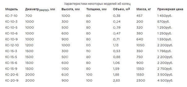 Таблица соотношения объёма ЖБ-кольца с его диаметром