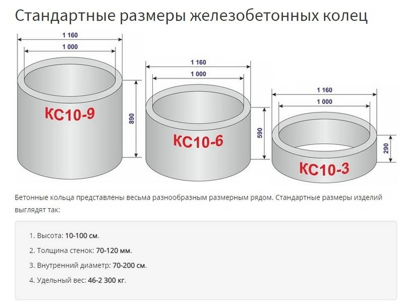 Стандартные бетонные кольца имеют массу 600 кг и следующие размеры: высота – 90 см, толщина стенок – 80 мм, внутренний диаметр – 100 см. Также производятся кольца других габаритов: их масса может варьироваться в диапазоне от 250 кг до 1 тонны.