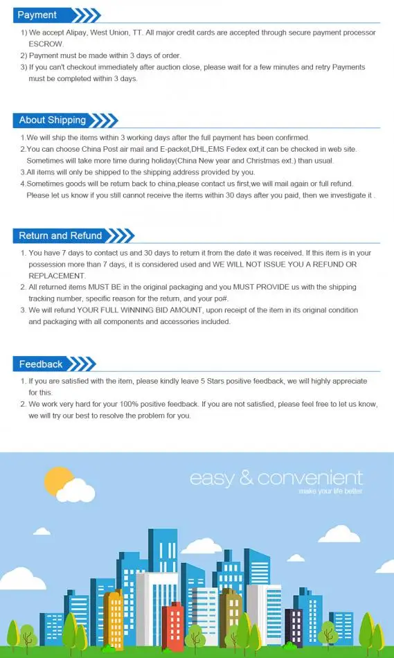 Мы принимаем следующие способы оплаты: кредитная карта, PayPal, AliPay, банковский перевод и т. Д.