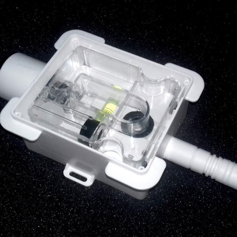 Узел сифона для дренажа кондиционера в канализацию скрыт в пластиковом коробе. Корпус агрегата устанавливается в стену. Тип размещения вертикальный, высота гидрозатвора 50 мм. К коробке подводятся две трубки – входной патрубок и выпуск в канализацию. Возможно подключение дренажных шлангов трех диаметров. Внутри корпуса размещается прозрачная кассета с водным затвором и запахозапирающим устройством. Клапан открывается при прохождении конденсата и опускается после ухода воды. Кассета сменная, ее самостоятельно извлекают и очищают от грязи.
