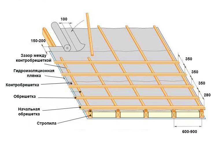 Монтаж обрешетки под металлочерепицу должен осуществляться на заранее размещенный слой гидроизоляции и, при необходимости, на конструкцию контробрешетки.