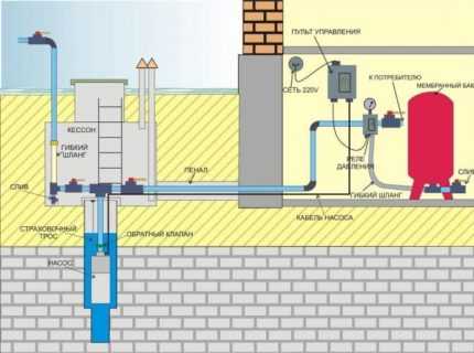 Схема автономного водоснабжения на основе погружного насоса. Мембранный бак можно располагать на довольно большом расстоянии от скважины