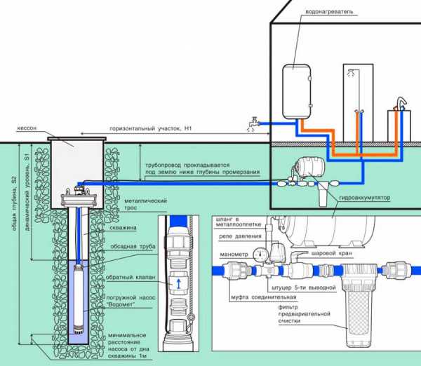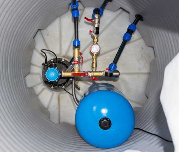 Как мы уже упоминали, обязательные элементы водоснабжающего оборудования индивидуального дома — гидроаккумулятор и управляющая автоматика. В случае с погружным насосом, высота подъёма которого в разы больше, чем у поверхностного, никаких ограничений по месту установки закрытого гидроаккумулятора нет.