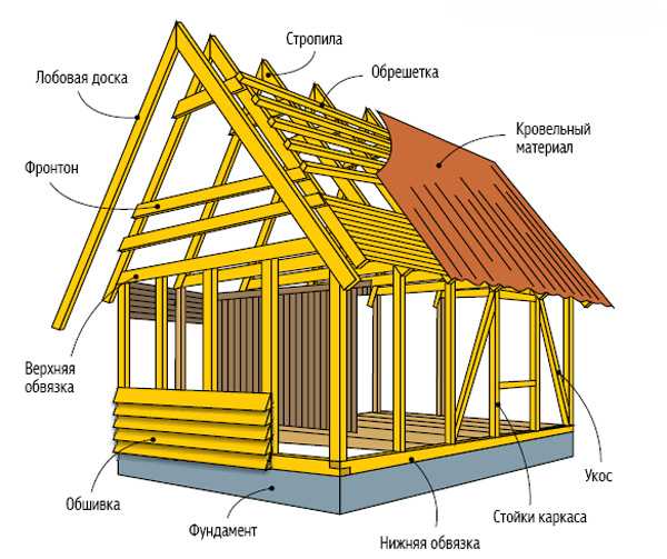 Схема основных элементовКровлю также собирают на земле, и готовую конструкцию устанавливают на здание. Края брусьев нужно стыковать с помощью торцевого соединения, расположенных под углом 50 градусов. Стропила также собираются на земле, после переносятся на каркас и скрепляются укосами и гвоздями. Каждые 10 см к стропилам необходимо крепить доски обрешетки. С выступом за крайние стропила на 25 см. На обрешетку кладется рубероид, после этого идет финишная установка кровельного строительного материала.
