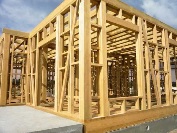 Самым популярным материалом для сборки каркаса является дерево. Обычно для этих целей используют брус сечением 100х100, 100х150 или 150х150. Размеры сечения зависят от запланированной толщины стен. Простой брус имеет тенденцию со временем изменять свою геометрическую форму — изгибаться и закручиваться. Во избежание связанных с этим неприятностей лучше приобрести клееный брус, у которого отсутствуют подобные минусы. На данном этапе собирают оконные и дверные проемы, ибо после обшивки каркаса сделать это будет гораздо сложнее.