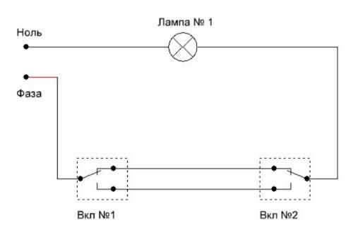 Возьмем электрическую цепь, состоящую из лампочки и двух одноклавишных проходных выключателей.