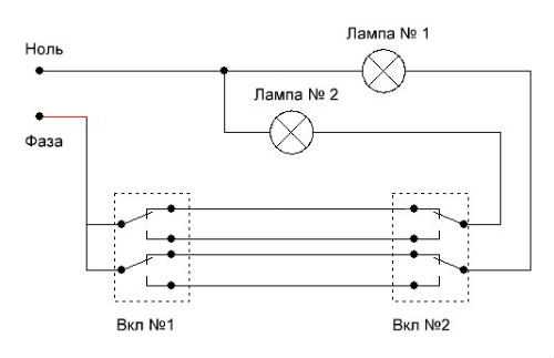 Двухклавишный выключатель и схема управления из разных мест дома двумя группами источников освещения