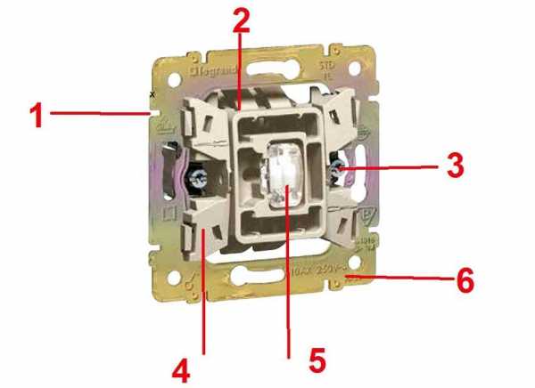 Особенности современных проходных выключателейРассмотренный выше центральный блок устанавливают в металлическую рамку (6). В этой конструкции применены специальные защелки (4) для надежной фиксации, ускорения монтажных операций. В других моделях применяют винтовые крепления. Вырезы (1) в рамке упрощают точное выключателей, розетоки других электротехнических приборов в одном блоке по горизонтали/вертикали.