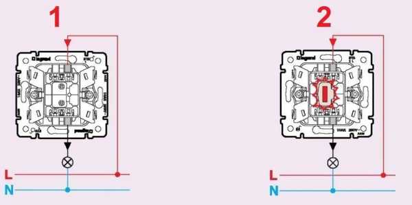 Обычный прибор (1) и выключатель с подсветкой (2) подключают в цепь по одной схемеОднако во втором варианте обеспечивается хорошая видимость устройства в затемненных помещениях. Следует отметить, что такое решение совместимо не со всеми видами ламп. В выключенном состоянии через них проходит небольшой по силе ток. Этого будет достаточно для питания светодиодов. Лампы накаливания и газоразрядные приборы подключать в такие схемы можно без ограничений.