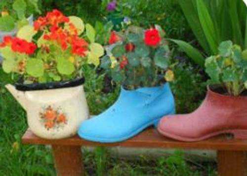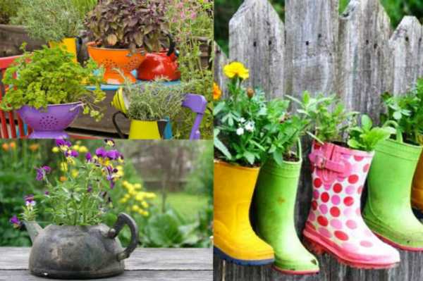 Если места на участке немного, пригодится идея использования старых резиновых сапог, чайников, небольших ведерок.
