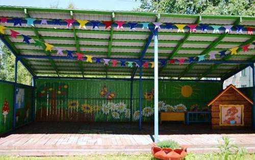 Место, где ребята отдыхают, занимаются на свежем воздухе или укрываются от дождя можно превратить в развивающую зону с помощью красок. Это самый популярный вариант. Можно не просто раскрасить веранду, но и нарисовать рисунки из сказок, животных, растения, героев мультфильмов. Рисовать можно и внутри и снаружи.