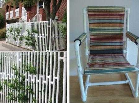 В последнее время особое применение нашли пластиковые трубы, поэтому поделки из них своими руками точно входят в новинки. Если правильно сделать соединения и тщательно продумать конструкцию изделий, то у вас получится кресло или забор. Трубы могут хорошо гнуться, также можно соединять их между собою в разных комбинациях, они имеют повышенную прочность, поэтому направлений для творчества может быть масса: от ограждений до мебели или элементов теплицы. Можете придумать новую поделку и удивить окружающих изобретательностью.