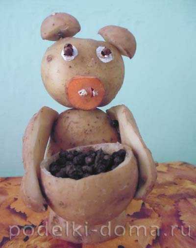 Попробуйте сделать вот такого лесного человечка из крупной картофелины немного неправильной формы.Чтобы поделка стала устойчивой, срежьте часть картофелины. Глаза и ротик слепите из пластилина. Уши вырежьте из морковки: кружочек напополам. Из морковки можно сделать и яркий галстук-бабочку. Шляпу выполните из части с хвостиком полосатого кабачка, а волосы – из семян клена. Вот и готов человечек. Осталось его поселить на лесной полянке с грибочками. Для этого понадобится мох, веточки и листики. Шляпки грибочков сделайте из картофелин и лука, а ножки – из морковки. Из пластилина слепите ягодки-чернички и маленькие грибочки. Ну а собирает лесной урожай человечек пусть в корзинку из небольшого картофеля. Зафиксируйте детали с помощью силикатного клея или пластилина, чтобы сделать поделку более долговечной.