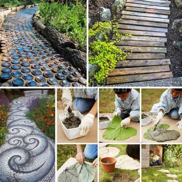 Или отдельной темой выделить постройку дорожек, тут в ход могут пойти и бутылки, и мозаика, и поленья и даже листы лопуха из бетона.