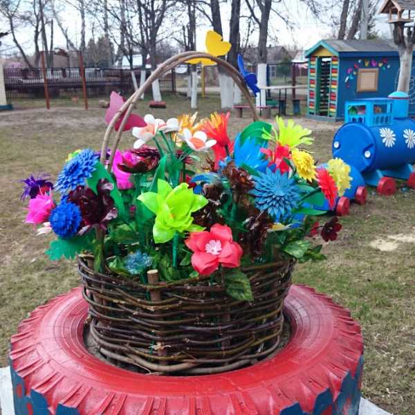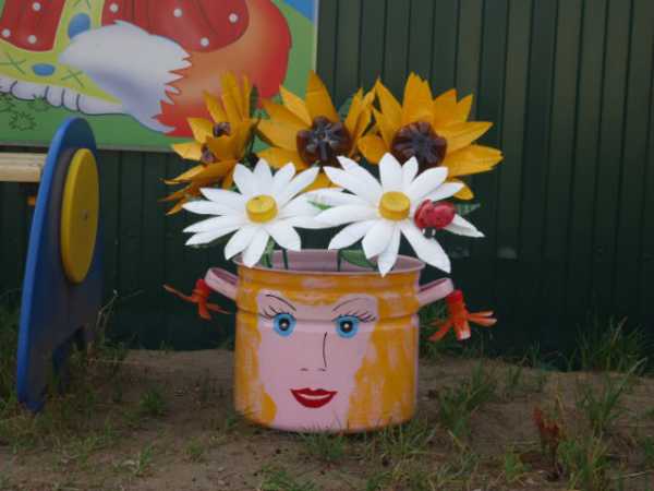 Если емкость совсем не подходит для создания клумбы, то ее можно использовать, как часть композиции, например, цветы, «вылившиеся» из кадушки. Смотрите подобное оформление клумбы в детском саду на фото.