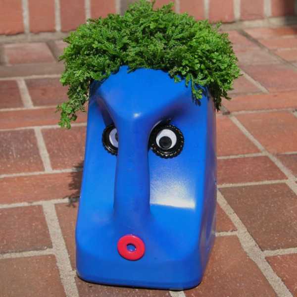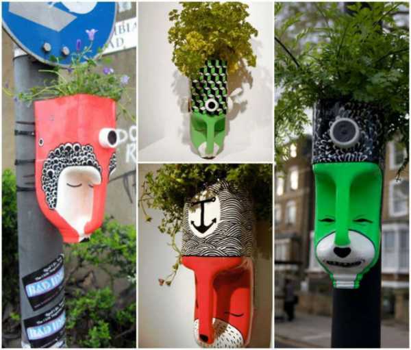 Популярна идея использования пластиковых бутылок большой емкости. Также в ход идут ящики из-под овощей, старые бочонки и ведра, из которых создаются разнообразные композиции.