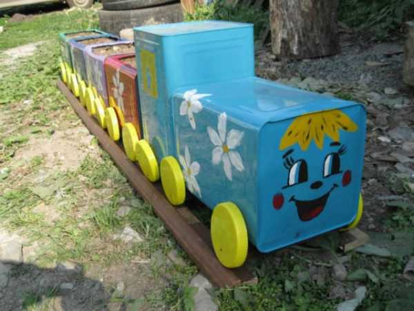 Для детей интересным развлечением станет вот такая песочница паровозик, в некоторых вагончиках самостоятельно выращивать цветы.