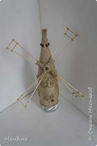 Сначала сделали мельницу из пластикового балона, обклеили его шпагатом, украсили.