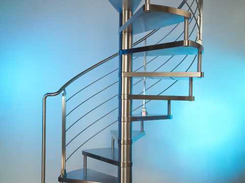 - Труднее всего подобрать и изготовить из нержавейки перила лестницы винтового типа. Для создания цельной спирали используется техника гнутья металлического профиля по радиусу, что требует наличия специального оборудования и инструментов;