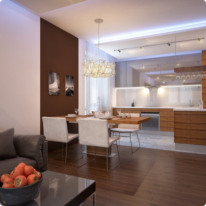 Чтобы разграничить кухню и гостиную, можно подсветить барную стойку.