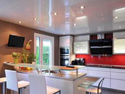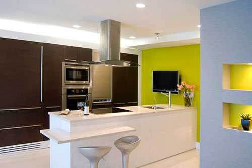 Интерьер с эффектом зонирования — когда с помощью цветовых решений кухня визуально зонируется на обеденную зону, зону приготовления пищи и мытья посуды, барную зону.