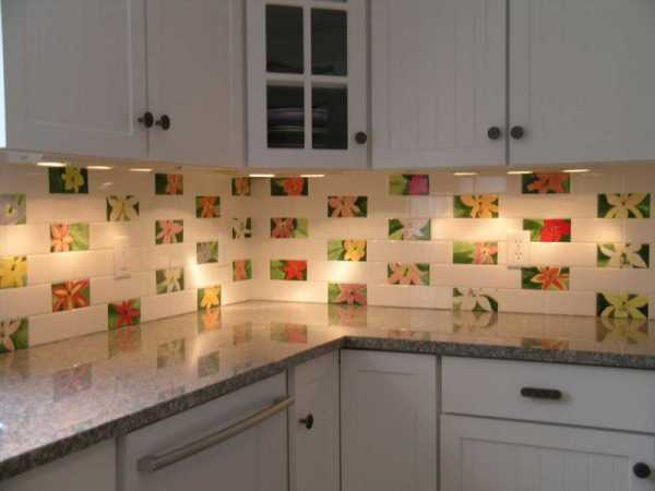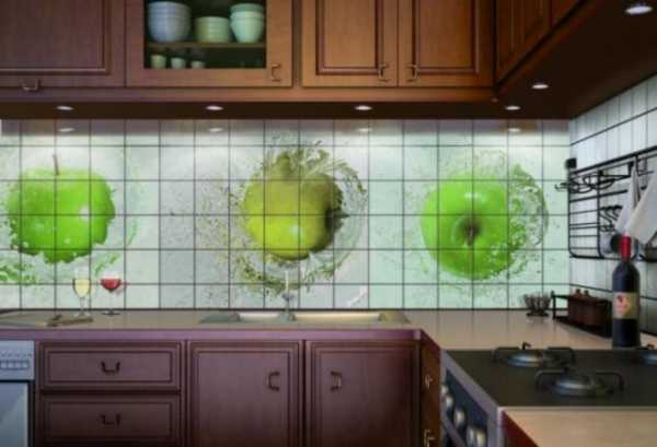 Современным и новомодным решением считается отделка рабочей зоны на кухне специальной фотоплиткой. Широкоформатное изображение какого-нибудь красивого пейзажа, натюрморта или семейной фотографии придаст индивидуальности. Новейшие технологии нанесения картинки на плитку позволяют избежать возможности повреждения или выцветания.