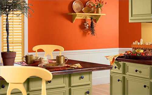 При выборе цвета краски или другого покрытия отделки кухни, помните, что холодные оттенки: синие, зеленые способствуют понижению аппетита, а теплые тона: красные, желтые будут вызывать повышенный аппетит. Конечно, выбор цветов должен опираться на тона кухонной мебели (см. фото). Если гарнитур имеет яркий цвет, то лучше красить стены краской светлых, спокойных оттенков. А если мебельный ансамбль выполнен в неброской цветовой гамме, то стены можно окрасить в более яркие цвета.