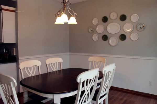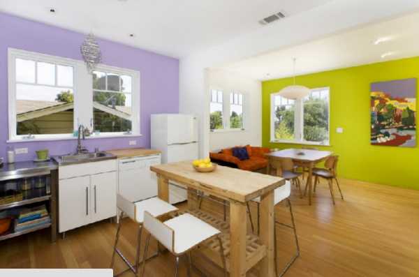 Кухню можно отделать с разделением зон: зону для приготовления оформить одним цветом, а зону приема пищи – другим (см. фото). К примеру, стену для готовки можно отделать светло-фиолетовым цветом, а место, где находится обеденный стол – салатовым или желтым. Также кухонную зону можно оформить в белый цвет с серыми разводами, а остальные стены отделать ярким покрытием.