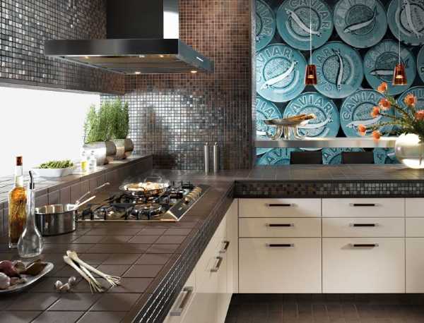 Мозаика всегда будет выглядеть эффектно и современном. Детали мозаики могут быть сделаны из керамики, стекла, природного камня, металла или дерева. С помощью этого приема можно внести разнообразие в интерьер, однако к выбору нужно подойти очень тщательно, особенно определяясь с цветом. Подобрать мозаику нужно в тон полу, потолку или кухонной мебели.