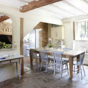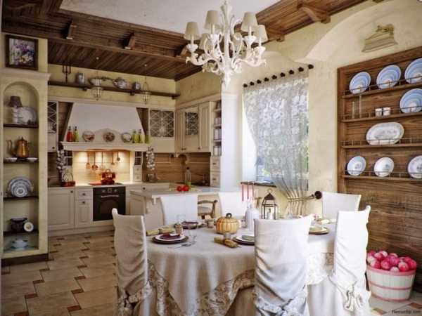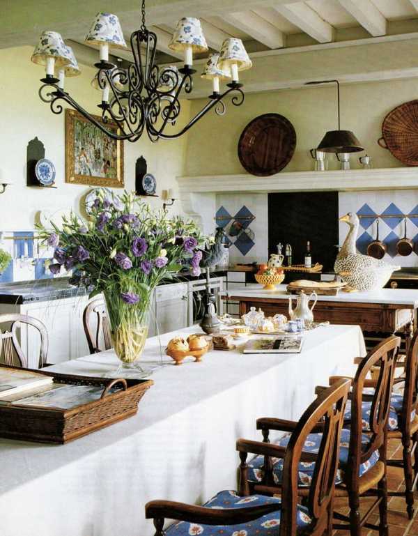 Плита – важнейшая часть сельского дома, поэтому она должна быть основательной, массивной, одной из главных составляющих кухонного интерьера. Посредине кухни – большой деревянный стол, на стульях для кухни – тканевые чехлы, подушечка под спину. На стенах – картины в простеньких рамочках: цветочные букеты, незамысловатые пейзажи, натюрморты.