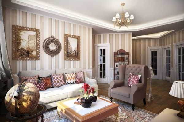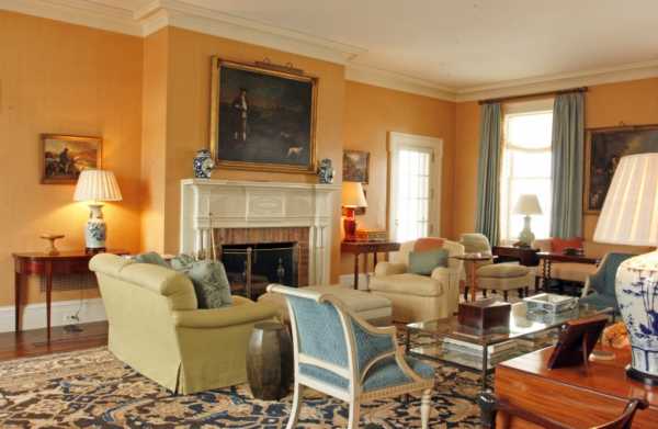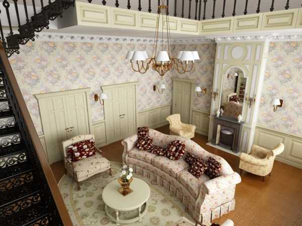 Гостиная комната коттеджа, оформленная в классическом стиле