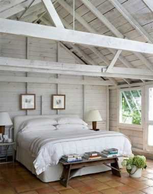 Для кухни – глазурованный кирпич, плитка или натуральный камень. Поток – просто покрашен белой краской, исключение – балки для контраста выделяют темным. Окна – деревянные белого цвета, в спальне – французские, от самого пола.