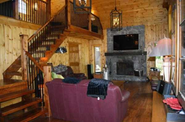 14 — Просторный деревянный дом оформлен под «современный» кантри. О нем напоминает простая деревянная мебель, пестрые коврики, тонированная «вагонка». Однако музыкальный центр и модный центральный камин — приметы текущего века.