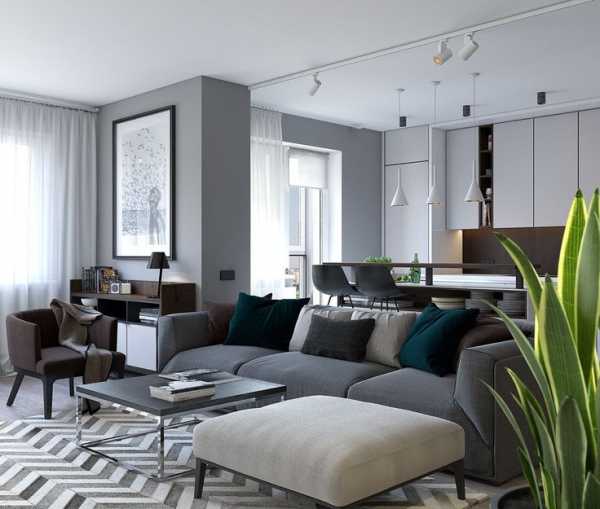6 — Обстановка гостиной выполнена как будто в черно-белой графике, которую смягчает большое количество оттенков и плавные силуэты мягкой мебели.