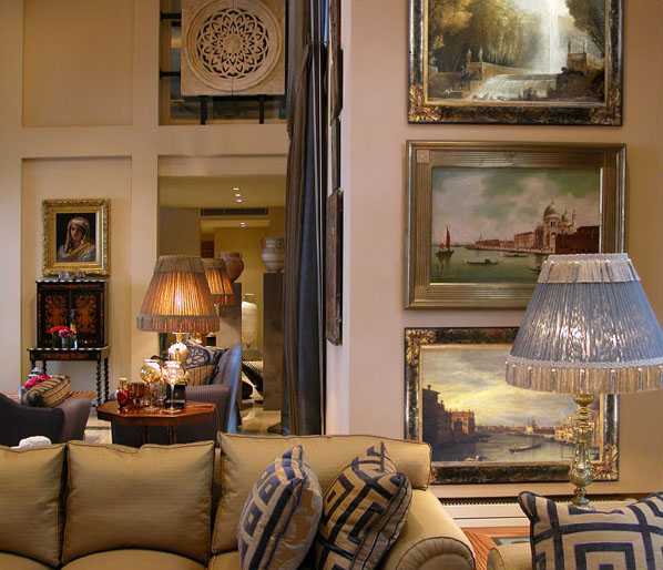 В «классике» важно выделить центр, например, красивая крупная люстра, помещенная в центр гипсового медальона. И уже от нее симметрично располагаются все архитектурные детали, мебель и элементы декора. Мебель – натуральное дерево, изогнутые резные ножки, золочение, бронзовые накладки, с обивкой из дорогих тканей. Стены можно украсить симметрично размещенными картинами в золоченных пышных рамах.