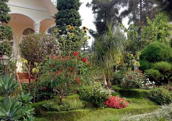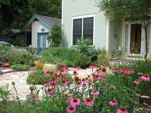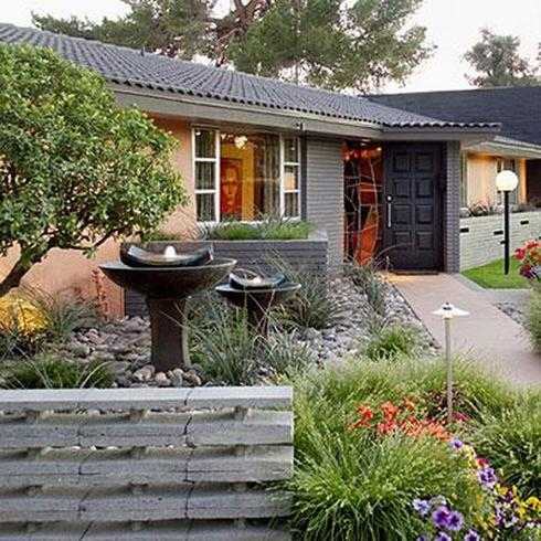 - Возле дома с непримечательным дизайном не рекомендуется создавать изысканный ландшафт. Он только акцентирует внимание на прозаичности строения. Его можно украсить красивоцветущими (но не эксклюзивными) растениями;