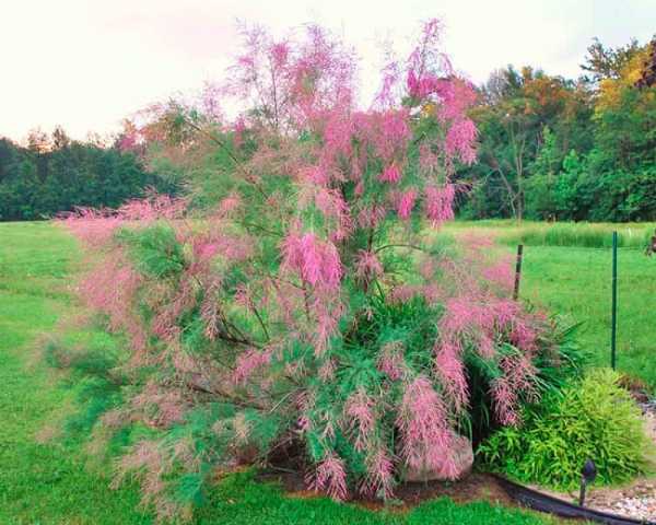 - Тамариск – мелкие чешуевидные листики напоминают короткую хвою, цветет розовыми вытянутыми соцветиями, собранными в метелки;