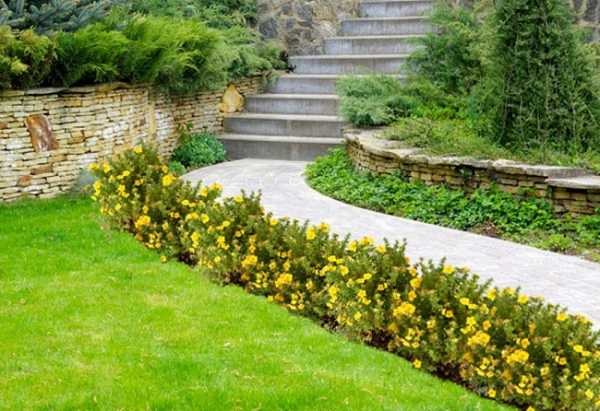 Магония падуболистная зимойНевысокие кустики лапчатки подойдут для создания колоритного бордюра вдоль дорожки. С конца весны до середины лета она цветет яркими желтыми цветками с блестящими лепестками, а в остальное время не теряет привлекательности благодаря мелким вечнозеленым листикам.