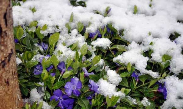 Барвинок голубойВажно. В зимний период рассчитывать на декоративность почвопокровных вечнозеленых растений не приходится, так как они все равно скрыты под снегом. Основная их ценность состоит в том, что ранней весной, сразу после таяния снега, живописные зеленые куртины этих растений появляются первыми.
