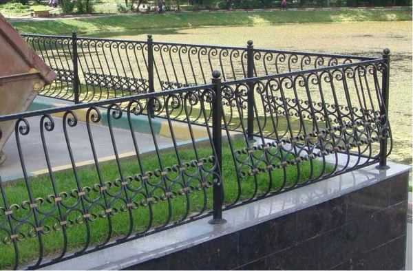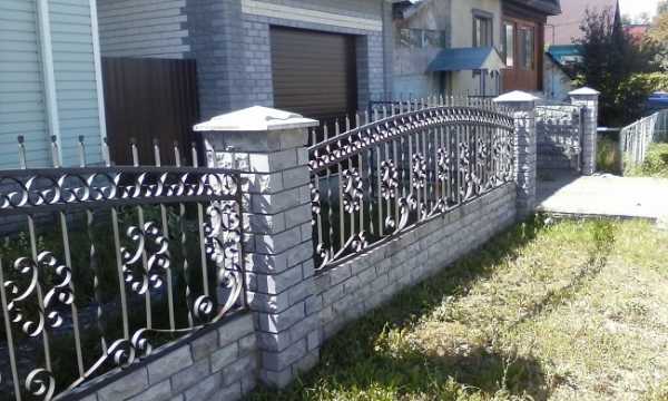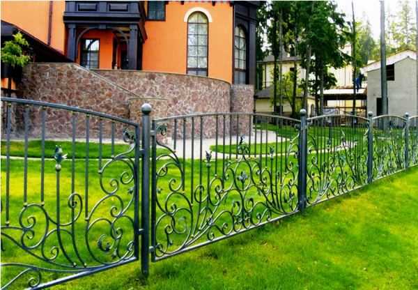Металлическая ограда с коваными элементами тоже смотрится хорошо.