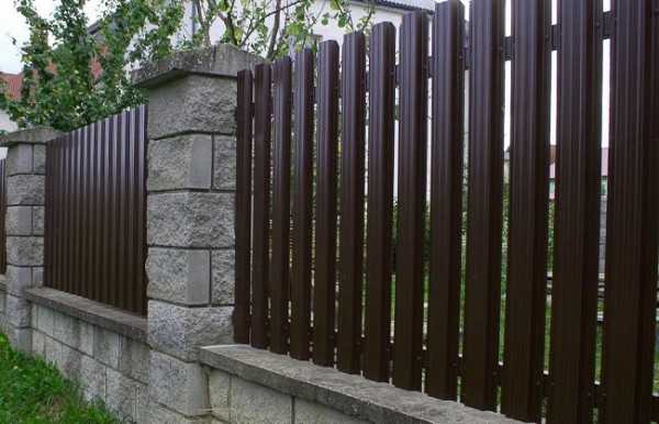 Металлический забор также можно сделать на бетонном фундаменте, а опоры из труб обложить кирпичом. В этом случае к стойкам сначала привариваются поперечные планки, на которые будет крепиться профнастил, а уже после этого выполняется кладка.