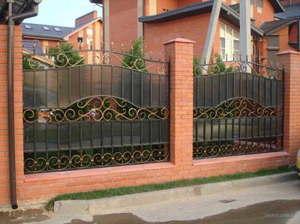 Совет. Если нужно установить открытый забор, но хочется обеспечить некоторую скрытость двора, лучше заказать кованый забор с поликарбонатом. Полупрозрачный материал хорошо пропускает свет, но через него почти не видно, что происходит за пределами ограды. Кроме этого, смотрится он довольно оригинально и представительно.