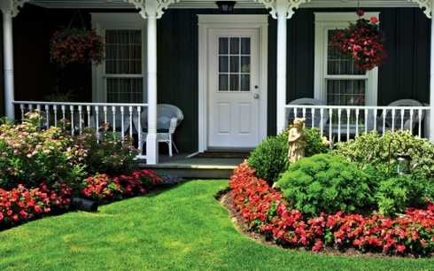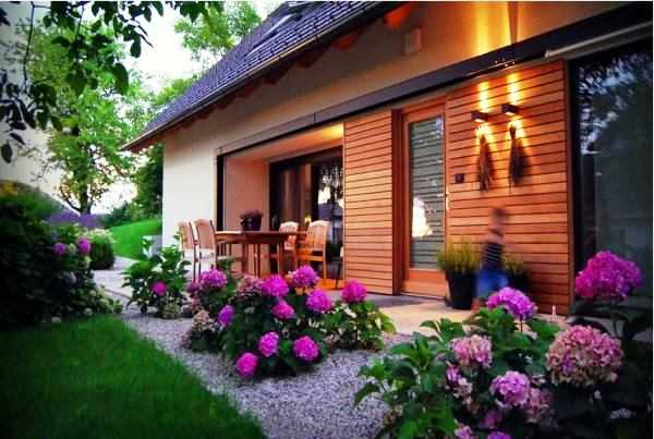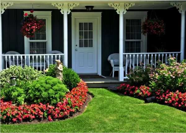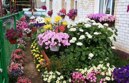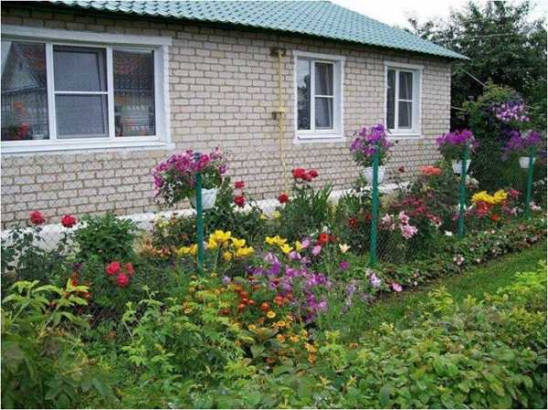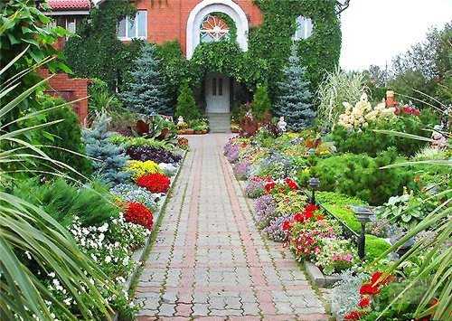 - палисадник находится очень близко к дому, преобладающий цвет должен красиво гармонировать с оттенком стен жилища;