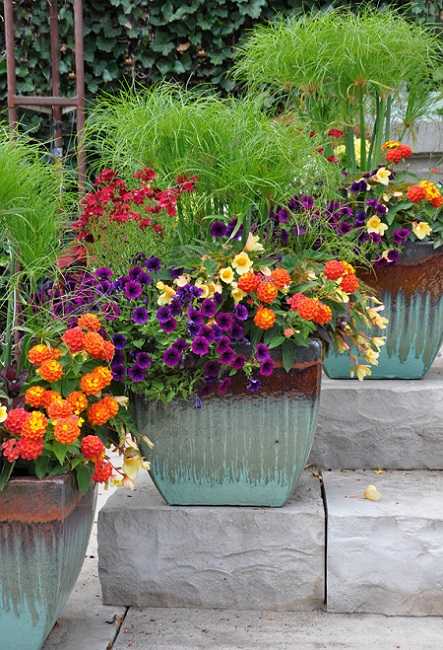 Задумка пришла к нам из западной Европы и пришлась по вкусу многим садоводам. Растительность высаживается в горшки разных размеров, и размещается в различных местах: на ступенях крыльца, вдоль дорожки, у стены дома на берегу искусственного водоема. Можно создать комбинированный цветник, в котором растения в контейнерах соседствуют насаждениями в открытом грунте.
