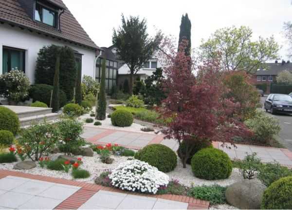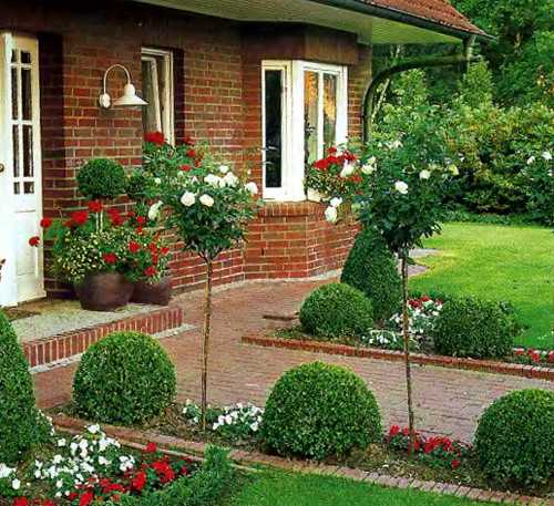 - фасад здания украшен большим количеством элементов декора, палисадник должен выглядеть более просто;
