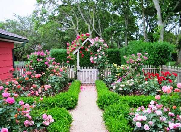 Палисадник романтического стиля невозможен без роз, лаванды, герани. Небольшие кусты, подстриженные в виде шара, растения в горшках и кадках на дорожках. Все это придает ощущение изысканности.