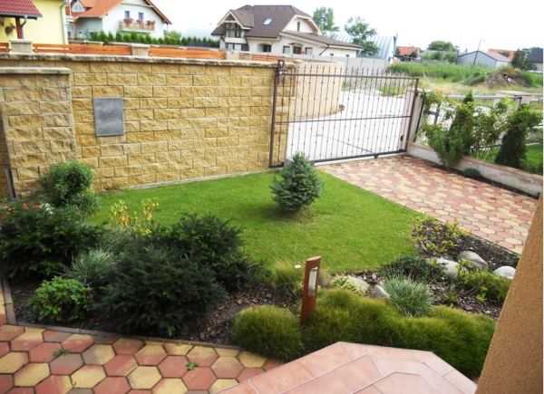 Дизайнеры в современных палисадниках рекомендуют использовать альпийские горки, рокарии и даже небольшие искусственные водоемы (см. фото). При этом не рекомендуется засаживать их слишком высокими деревьями, которые могут закрыть весь прекрасный вид. Лучше всего на участке перед домом высаживать небольшие хвойные деревья или кусты.